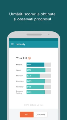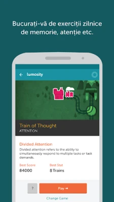 Vă invităm să vă alăturați acestei călătorii fascinante alături de Lumosity. Prin angajamentul dumneavoastră, contribuiți nu doar la dezvoltarea personală, ci și la avansarea înțelegerii globale a modului în care funcționează și poate fi optimizat creierul uman. Indiferent dacă doriți să vă ascuțiți anumite abilități sau pur și simplu să vă mențineți mintea ageră, Lumosity oferă o modalitate stimulantă de a face exact acest lucru. Platforma este disponibilă pentru o audiență largă, acceptând setări în engleză, germană, japoneză, franceză, spaniolă și portugheză, pentru o experiență personalizată, cu engleza ca limbă implicită pentru dispozitivele fără setări locale acceptate.