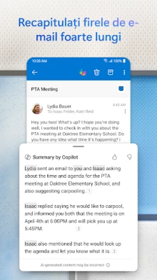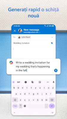 Fie că ești la birou sau în mișcare, Outlook pentru Android îți oferă instrumentele necesare pentru a gestiona fiecare zi cu eficiență maximă. Stabilește rapid o întâlnire, confirmă-ți disponibilitatea cu doar câteva atingeri sau atașează un fișier important direct dintr-o listă personală, fără a părăsi aplicația. Integrarea perfectă cu suita de instrumente Microsoft, inclusiv Word, Excel și PowerPoint, te asigură că ai întotdeauna la îndemână tot ce îți trebuie pentru a lucra la documente și prezentări, oriunde te-ai afla.