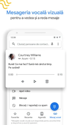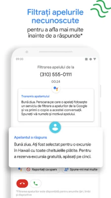Nu lăsa apelurile necunoscute să-ți dicteze agenda. Funcția inteligentă de Screening de apeluri din Aplicația Telefon preia automat apelurile de la numerele neidentificate, filtrând discret spammerii fără a te deranja. Obține detalii esențiale despre apelanții necunoscuți înainte de a decide să răspunzi. Experiența ta de mesagerie vocală este, de asemenea, revoluționată: vizualizează mesajele direct în aplicație, citește transcrierile, ascultă-le în orice ordine și gestionează-le cu ușurință – șterge sau salvează – fără a mai fi nevoie să suni la mesageria vocală tradițională.